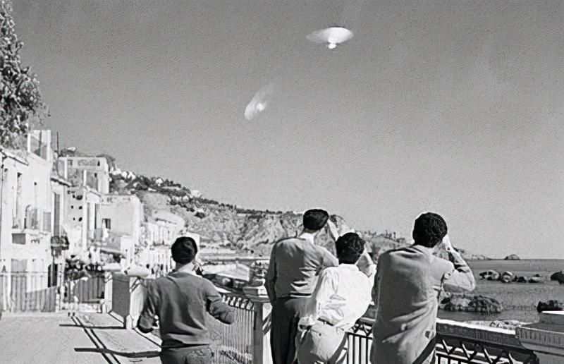 1954年10月,4名男子正注视着意大利西西里上空的不明飞行物。